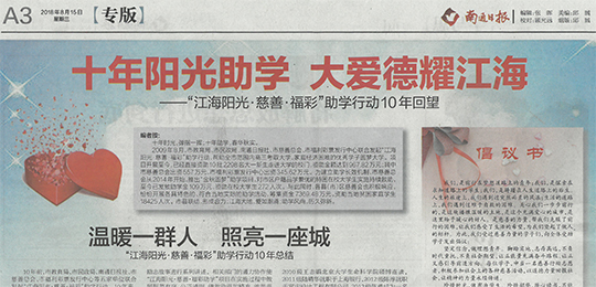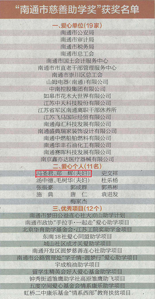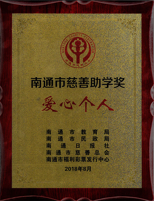 2018年8月15日,南通市教育局、南通市民政局、南通日?qǐng)?bào)社、南通市慈善總會(huì)、南通市福利彩票發(fā)行中心公布了“南通市慈善助學(xué)獎(jiǎng)”評(píng)選結(jié)果,南通三圣石墨設(shè)備科技股份有限公司董事長(zhǎng)馮圣君、鄭輝夫婦榮獲“南通市慈善助學(xué)獎(jiǎng)愛(ài)心個(gè)人”光榮稱號(hào),全市僅有11人獲此殊榮。