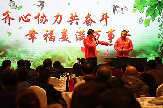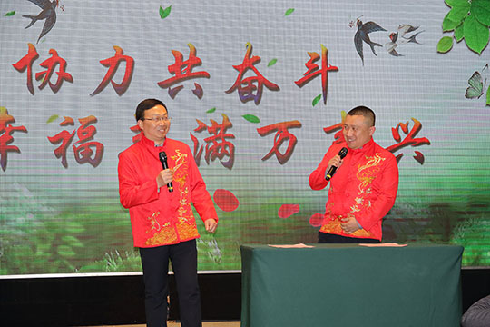 由阿彬主任、副總工阿杰自編自演的相聲《幸福三圣》,再現(xiàn)了洋溢在三圣集團大家庭中的濃濃幸福氛圍。這篇原創(chuàng)的相聲題材,傾注了編者的智慧和用心,巧妙將2018年度三圣大事件貫穿其中,詼諧幽默,“包袱”連連,獲得滿堂喝彩,兩位相聲演員也被贊“三圣德云社”;