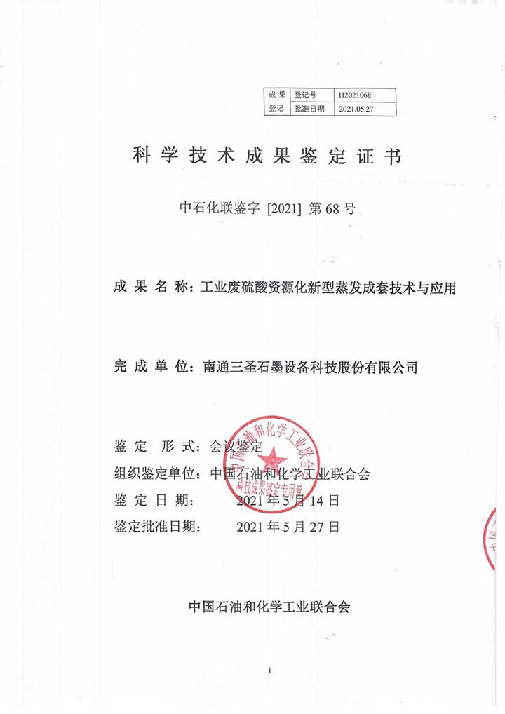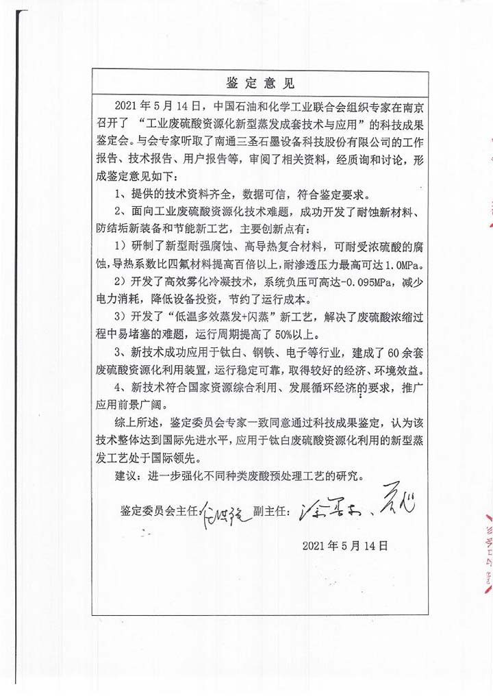 2021年5月27日,中國石油和化學(xué)工業(yè)聯(lián)合會批準(zhǔn)了南通三圣石墨設(shè)備科技股份有限公司“工業(yè)廢硫酸資源化新型蒸發(fā)成套技術(shù)與應(yīng)用”的科技成果鑒定,由南京大學(xué)任洪強(qiáng)院士擔(dān)任主任,華東理工大學(xué)涂善東院士、南京工業(yè)大學(xué)喬旭校長擔(dān)任副主任的鑒定委員會專家一致認(rèn)為,該技術(shù)整體達(dá)到國際先進(jìn)水平,應(yīng)用于鈦白廢硫酸資源化利用的新型蒸發(fā)工藝處于國際領(lǐng)先。