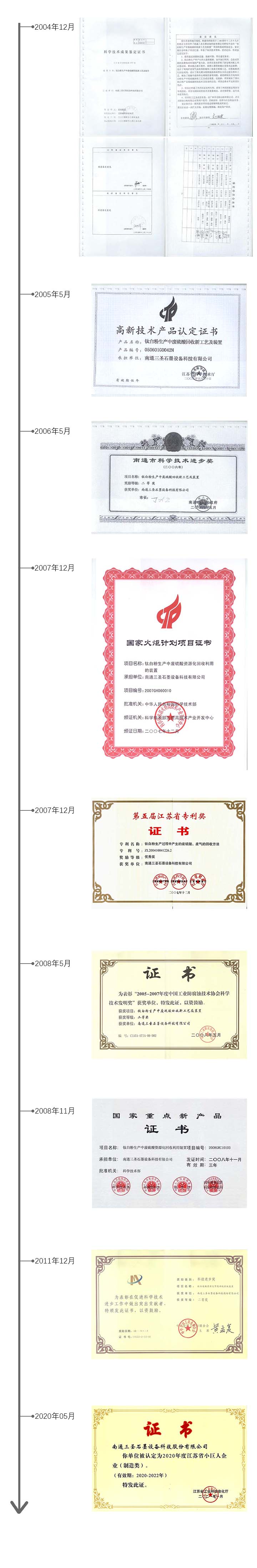 南通三圣該項技術(shù)先后得到了政府諸多部門的高度評價。2004年12月,“鈦白粉生產(chǎn)中廢硫酸回收新工藝及裝置”通過江蘇省科技廳組織的科技成果鑒定,鑒定意見指出,該項成果填補(bǔ)了國內(nèi)鈦白粉產(chǎn)業(yè)廢硫酸回收技術(shù)及裝備的空白,總體水平達(dá)到國際先進(jìn)。2005年5月,該項成果被認(rèn)定為江蘇省高新技術(shù)產(chǎn)品。2006年5月,該項成果榮獲南通市科技進(jìn)步二等獎。2007年12月,“鈦白粉生產(chǎn)中廢硫酸資源化回收利用的裝置”被科技部列為國家火炬計劃項目。2007年12月,“鈦白粉生產(chǎn)過程中產(chǎn)生的廢硫酸、廢氣的回收方法”榮獲江蘇省優(yōu)秀專利獎。2008年5月,“鈦白粉生產(chǎn)中廢硫酸回收新工藝及裝置”榮獲中國工業(yè)防腐蝕技術(shù)協(xié)會技術(shù)發(fā)明二等獎。2008年11月,“鈦白粉生產(chǎn)中廢硫酸資源化回收利用裝置”被科技部、環(huán)保部、商務(wù)部、國家質(zhì)檢總局認(rèn)定為國家重點新產(chǎn)品。2011年12月,“鈦白廢酸資源化節(jié)能回收系統(tǒng)裝置”榮獲中華全國工商業(yè)聯(lián)合會科技進(jìn)步二等獎。2020年,公司以工業(yè)廢副硫酸低能耗蒸發(fā)濃縮與資源化回收成套裝備產(chǎn)品獲得江蘇省專精特新小巨人企業(yè)榮譽(yù)稱號。