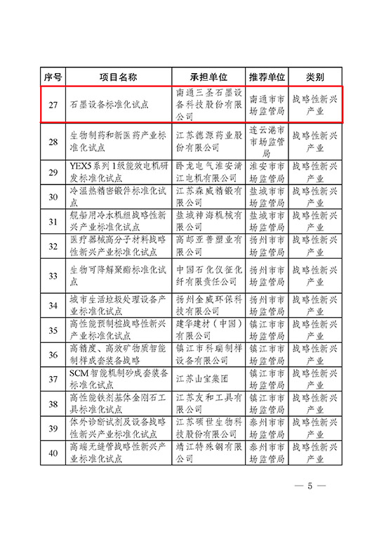 南通三圣標(biāo)準(zhǔn)化工作再傳捷報(bào),公司申報(bào)的“石墨設(shè)備標(biāo)準(zhǔn)化試點(diǎn)”項(xiàng)目獲得江蘇省市場(chǎng)監(jiān)督管理局、江蘇省發(fā)展和改革委員會(huì)正式立項(xiàng),成為2022年江蘇省戰(zhàn)略性新興產(chǎn)業(yè)標(biāo)準(zhǔn)化試點(diǎn)41個(gè)項(xiàng)目之一,也是南通市獲此立項(xiàng)的兩個(gè)項(xiàng)目之一 。